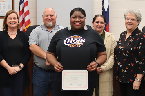 Joy Hudspeth, the choir director at Castroville Elementary School, received the Above and Beyond Award at Medina Valley ISD’s November board meeting. Seven of her choir students also received Star Student Awards at the meeting.